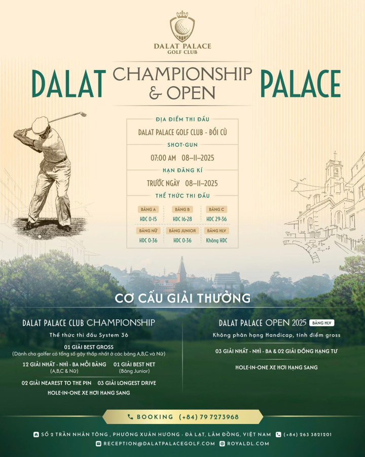 Da Lat Palace Open 2025: Giải mở rộng dành cho khách mời, các huấn luyện viên và golfer chuyên nghiệp – nghiệp dư trong và ngoài khu vực. Đây là cơ hội giao lưu, học hỏi và khẳng định vị thế chuyên nghiệp của sân trên bản đồ golf Việt Nam.