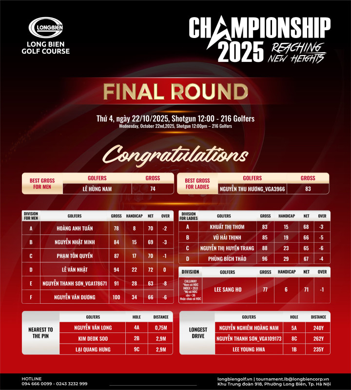 Long Bien Golf Course Championship 2025 không chỉ là nơi tìm ra nhà vô địch, mà còn là sân khấu của đam mê, nỗ lực và tình bằng hữu. Từ cú phát bóng đầu tiên đến giây phút đăng quang, tất cả đều hướng về một thông điệp chung: “Reaching New Heights – Vươn tới những đỉnh cao mới.” Với những giá trị bền vững đã gây dựng suốt 9 mùa giải, Long Bien Golf Course tiếp tục khẳng định vị thế là một trong những điểm sáng hàng đầu của Golf Việt Nam, nơi hội tụ đẳng cấp, cảm xúc và khát vọng chinh phục không giới hạn.