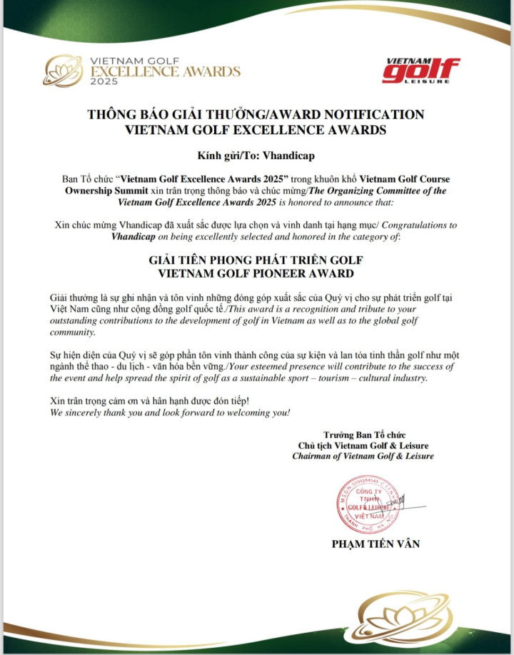 Giải thưởng Vietnam Golf Pioneer Award 2025 là sự ghi nhận cho hành trình 7 năm kiên định của vHandicap và VG Corp trong việc ứng dụng công nghệ để hiện đại hóa ngành golf Việt Nam, đồng thời khẳng định vị thế tiên phong của hệ sinh thái golf Việt trên bản đồ khu vực.