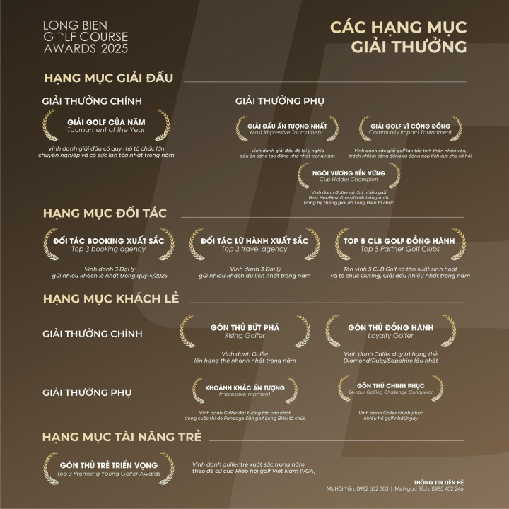 Tại Long Bien Golf Course Awards 2025, nhiều hạng mục quan trọng đã được vinh danh, ghi nhận những đóng góp nổi bật trong năm: