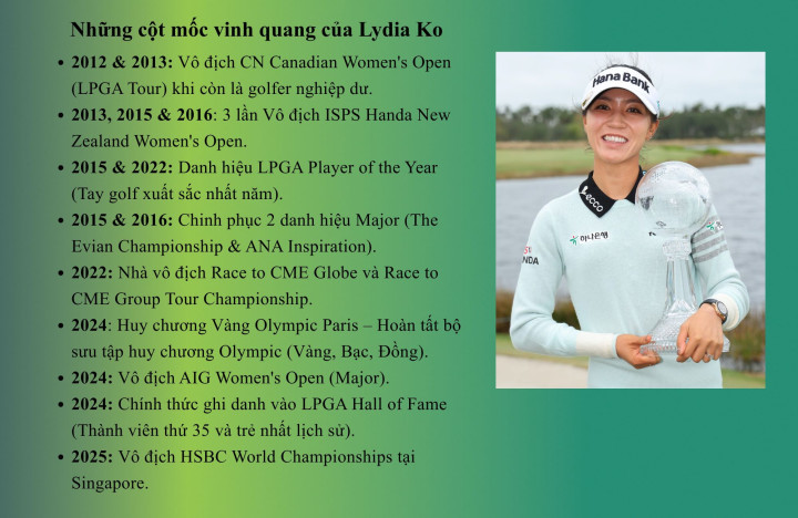 Với tấm Huy chương Vàng tại Olympic Paris 2024, Lydia Ko không chỉ hoàn tất bộ sưu tập huy chương Olympic hiếm hoi (Vàng – Bạc – Đồng), mà còn chính thức trở thành thành viên thứ 35 và là golfer trẻ tuổi nhất trong lịch sử LPGA Hall of Fame ở tuổi 27. Một cột mốc mang tính biểu tượng - không phải của một khoảnh khắc thăng hoa, mà của cả một hành trình dài được xây dựng bằng sự kiên định tuyệt đối.