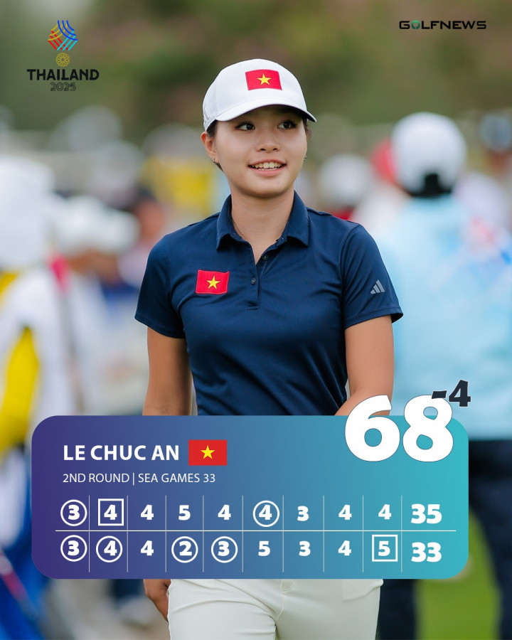 Lê Chúc An trở thành điểm sáng khi hoàn thành vòng 2 với 68 gậy (-4), ghi 6 birdie và chỉ mắc 2 bogey. Dù vẫn còn chút tiếc nuối khi thậm chí đã có thể đạt điểm số tốt hơn, màn trình diễn này vẫn là cú hích tinh thần cho hành trình chinh phục hai vòng còn lại của golfer 17 tuổi.