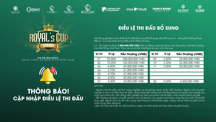 Royal’s Cup 2025 là giải đấu hoàn toàn mới trong hệ thống giải golf chuyên nghiệp của Việt Nam - VGA Tour. Diễn ra tại sân Royal Long An Golf & Country Club, Royal’s Cup 2025 mở màn làng golf Việt với quỹ thưởng lên đến 1 tỷ đồng, qua đó thu hút được những tên tuổi hàng đầu.