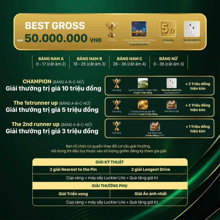 Bên cạnh đó, các giải kỹ thuật như Nearest to the Pin, Longest Drive, cùng các giải phụ như Giải Triển vọng, Giải ăn ảnh nhất đều mang đến những phần thưởng giá trị, tạo động lực thi đấu mạnh mẽ cho các golfer.
