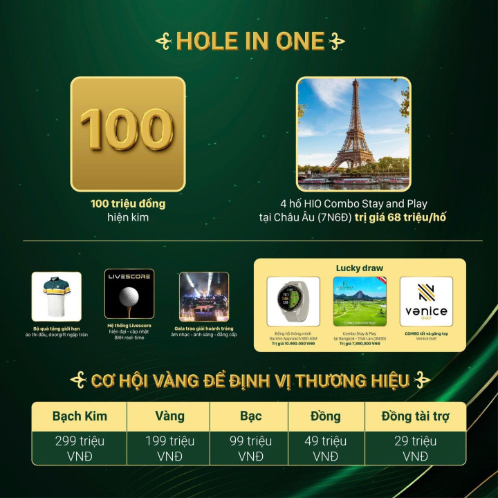 Phí bao gồm toàn bộ quyền lợi: 18 hố golf, caddy, xe điện, áo thi đấu, door gift, quà tặng gala và tiệc trao giải.