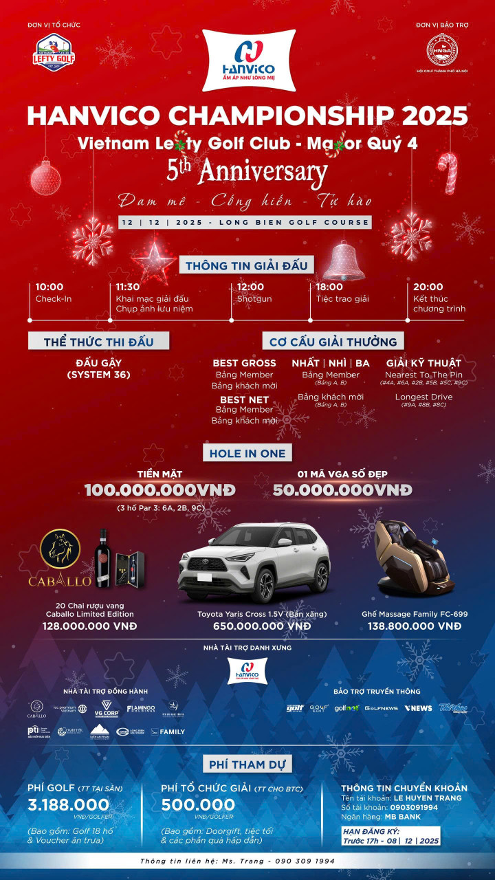 Giải HANVICO CHAMPIONSHIP 2025 sẽ bắt đầu lúc 12h00 (shotgun) ngày 12/12/2025 tại sân Long Biên. Đối tượng tham dự gồm hội viên Vietnam Lefty Golf Club và khách mời, thi đấu theo thể thức System 36 (handicap ngày). Giải hứa hẹn mang đến bầu không khí thể thao sôi nổi, gắn kết và đầy cảm xúc, đồng thời là lời tri ân dành cho các hội viên, đối tác và nhà tài trợ đã đồng hành cùng CLB suốt thời gian qua. Điểm nhấn đặc biệt của giải năm nay là hệ thống giải thưởng hấp dẫn, trong đó giải Hole-in-One có tổng giá trị lên tới 2 tỷ đồng. Đêm Gala Trao giải sẽ là dịp để các golfer cùng nhìn lại hành trình 5 năm đáng nhớ, tôn vinh những dấu ấn tự hào và truyền thêm nhiệt huyết cho chặng đường phát triển mới của cộng đồng golfer tay trái Việt Nam. Bảng điểm sẽ được cập nhật real-time trên các kênh truyền thông của CLB và VG Corp – đơn vị truyền thông đồng hành.
